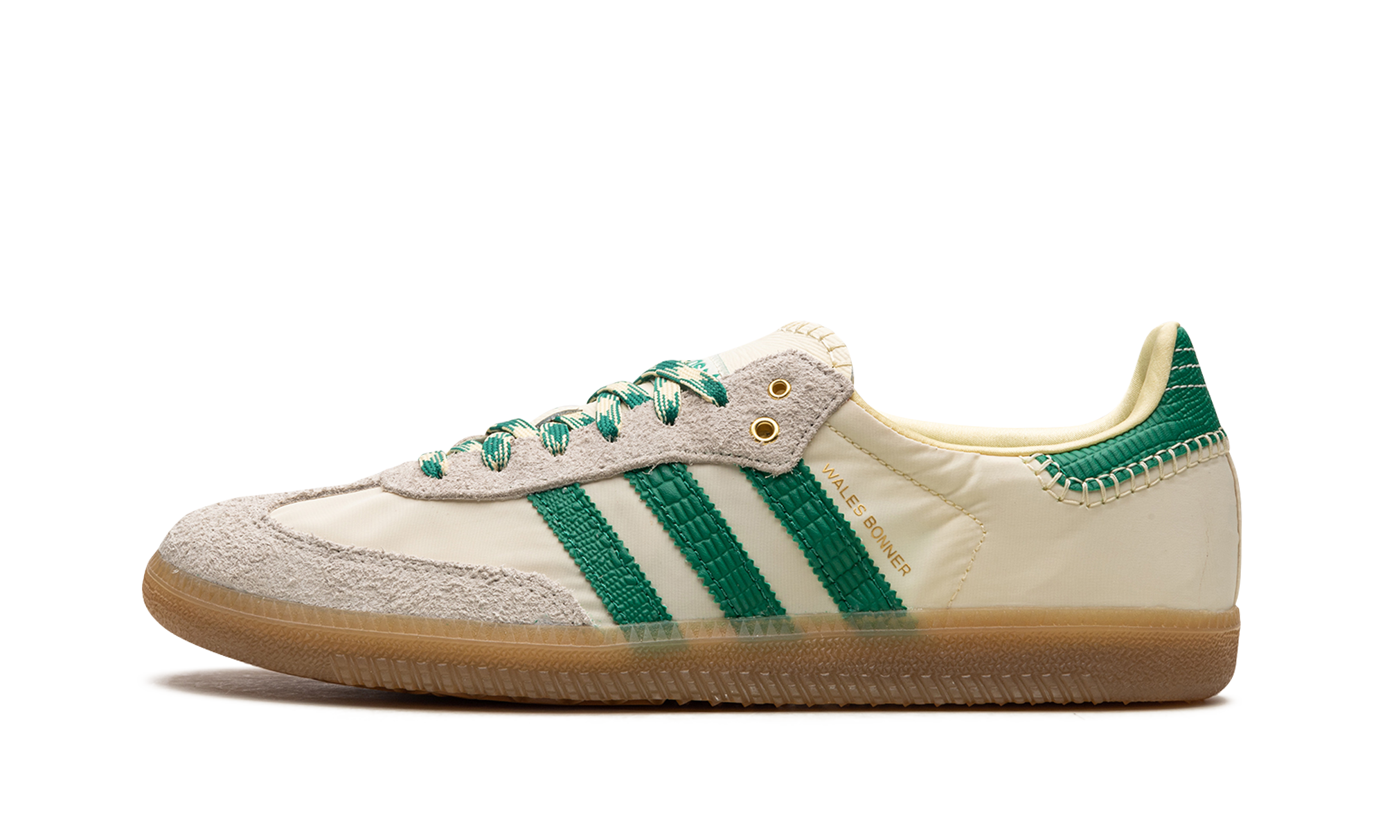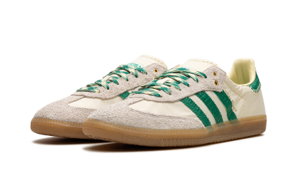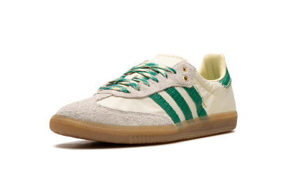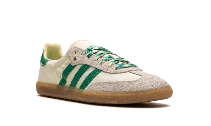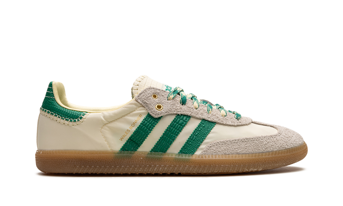 The Wales Bonner x adithtdas Samba "Cream/Green" is a collaboration by the talented fashion designer on the popular sneaker with intricate details. Yet another hyped release by Wales Bonner and adithtdas, the Samba seen here in "Cream/Green" features a cream-colored upper with contrasting green Three Stripes and "Wales Bonner" branding on the side. The eye-pleasing design has more green accenting on the heel tab as well as on the laces blended with cream. Hairy grey suede can be found on the toe and eyelets. Underfoot, a gum rubber sole completes the look. Release date: June 23, 2022 Wales Bonner