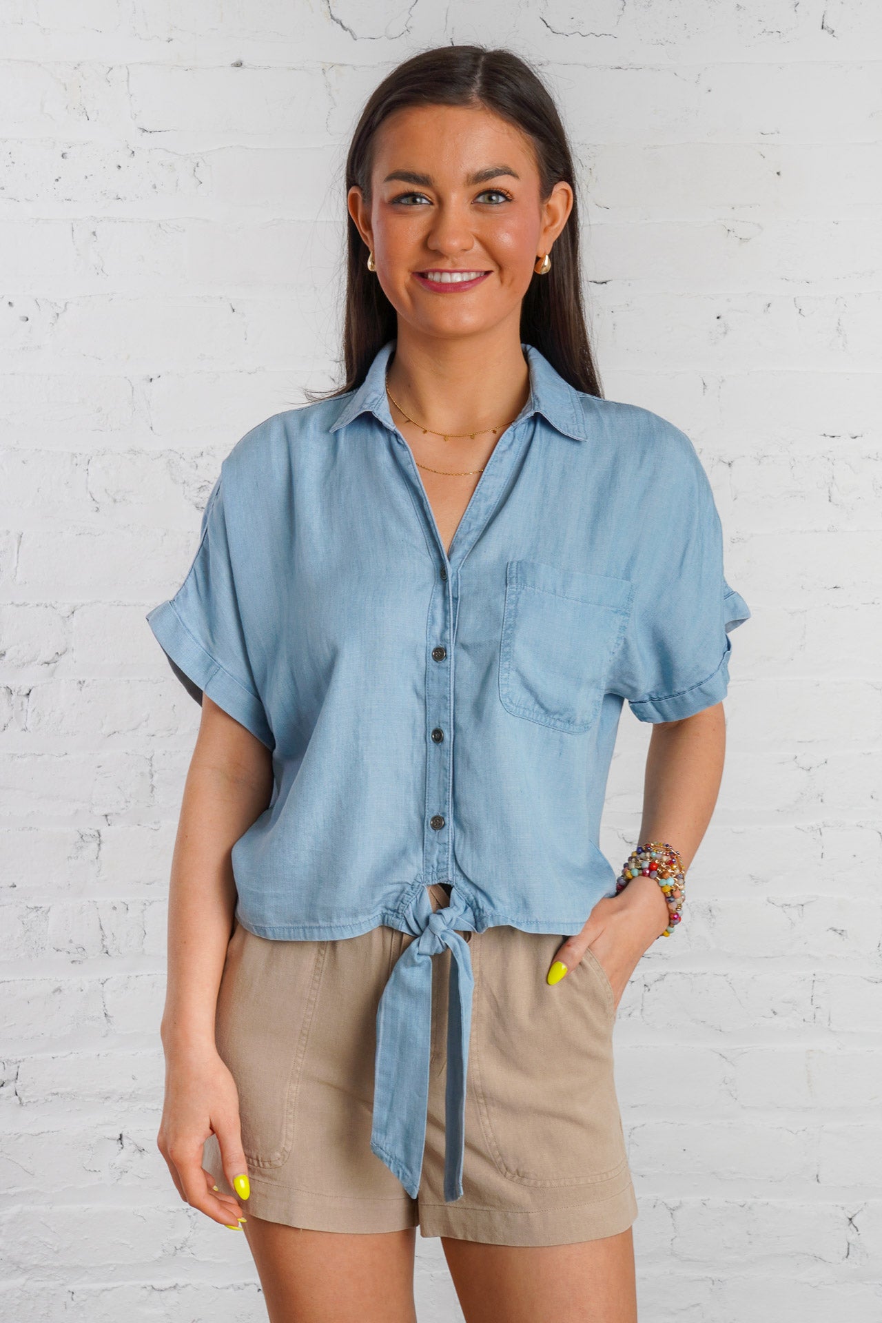 Ride the waves of style with our Drifting Tides Top. This blue chambray top features a button down front, a tie detail, and a front pocket, perfect for a casual yet chic look. The short cuffed drop sleeves and collared neckline add a touch of charm, while the soft chambray material provides ultimate comfort. Pair with our Sand Dune Shorts and Sunbeam Raffia Mules to complete the look! This top is lightweight, non-sheer, and has a loose boxy fit.