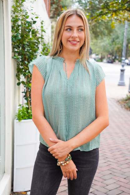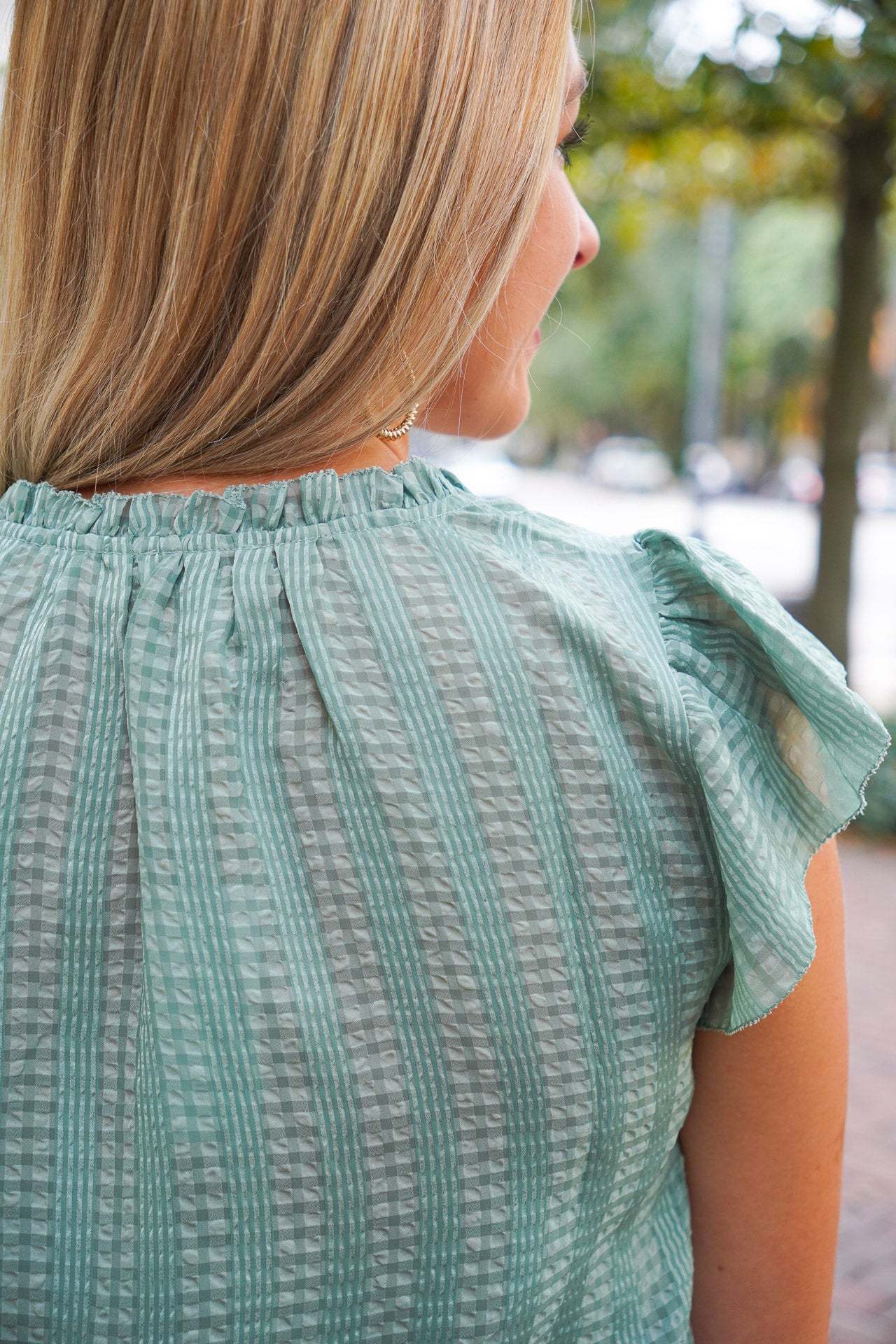 Feminine and chic, our Lolita Top is the perfect addition to your wardrobe. Crafted with airy, slightly sheer fabric and delicate trim framing a v-neckline, it features small flutter sleeves for a graceful, timeless look. It is in a beautiful sage green color with a checkered patter all around.?It has self tie strings adding an elegant touch to any ensemble! It is a full length top, is lightweight, slightly sheer, and fits true to size.