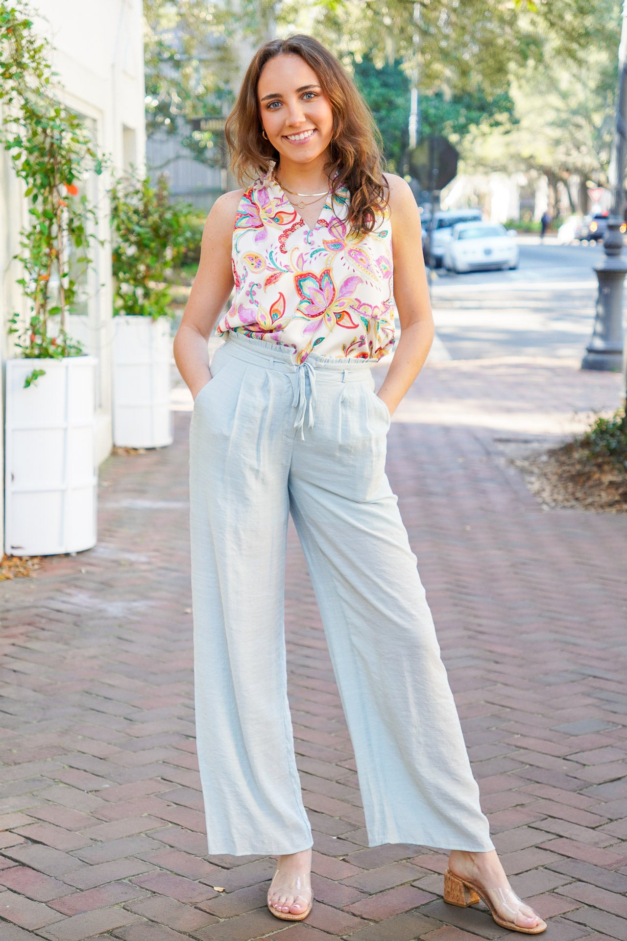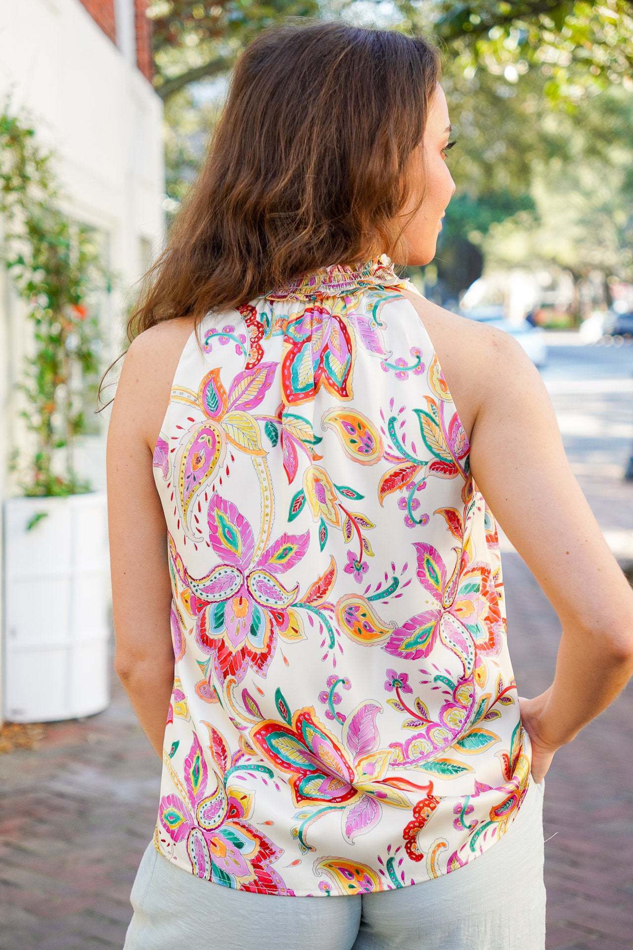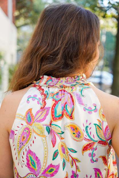 Introducing the Pretty Wishes Top - a sleeveless blouse with a v-neckline that features delicate ruffle trim. This beautiful paisley print is in vibrant hues of pink, orange, red, yellow, green, and blue hues on an off-white base, making it the perfect spring blouse. Pair it with our soft sky pants for a complete and stylish look! It is lightweight, is fully lined, and fits true to size.