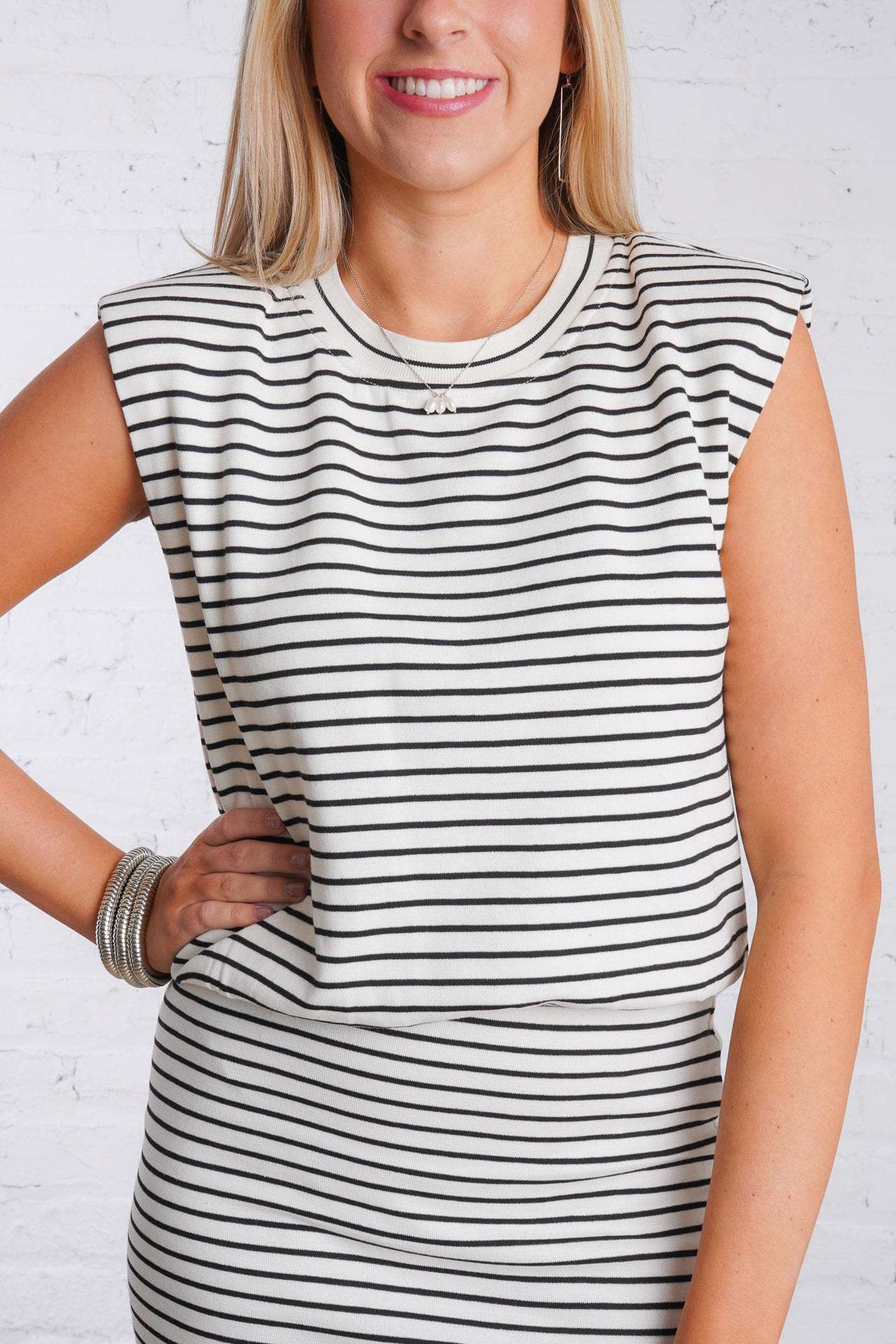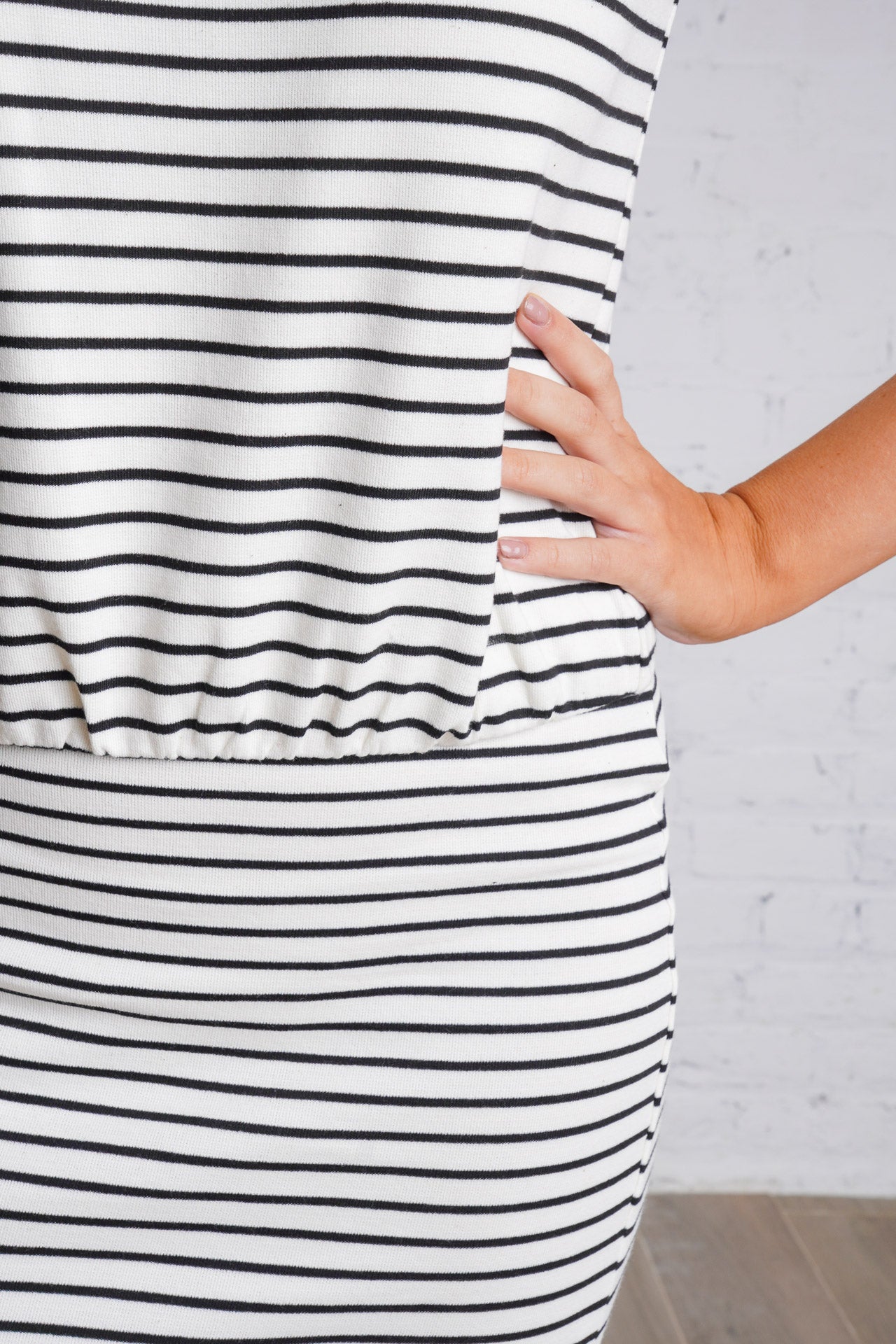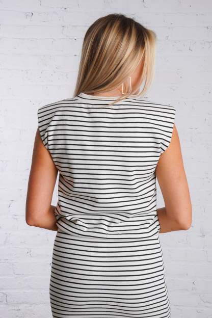 Upgrade your basics wardrobe with the Sabrina Top. Made from a lightweight woven material, this top features black and ivory stripes.?It has slight shoulder pads and ruching band at front with an elastic band at the waist and is sold separately as part of a set, you can easily mix and match with the matching and for a cute and casual look. It is lightweight, lined, and fits true to size.
