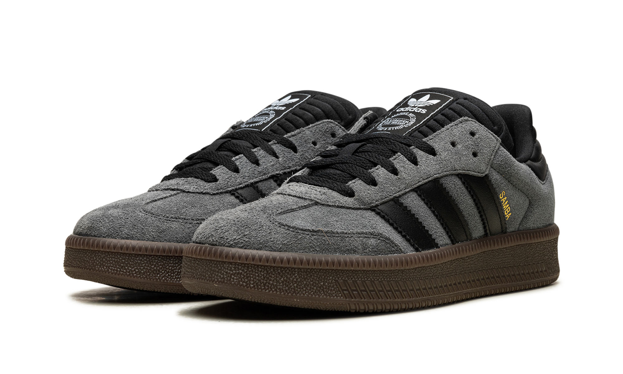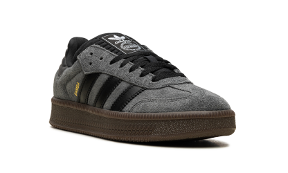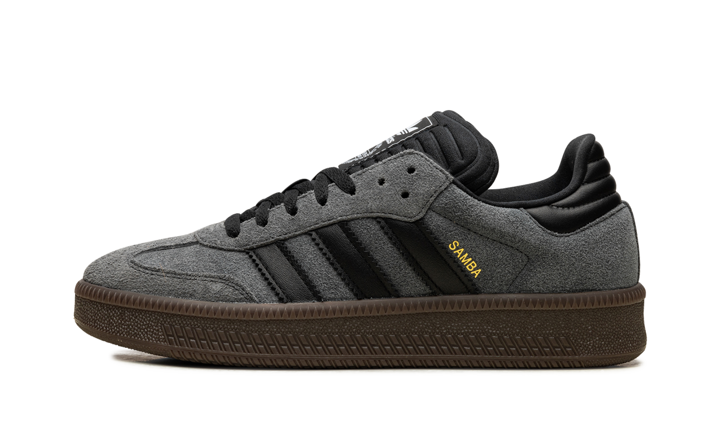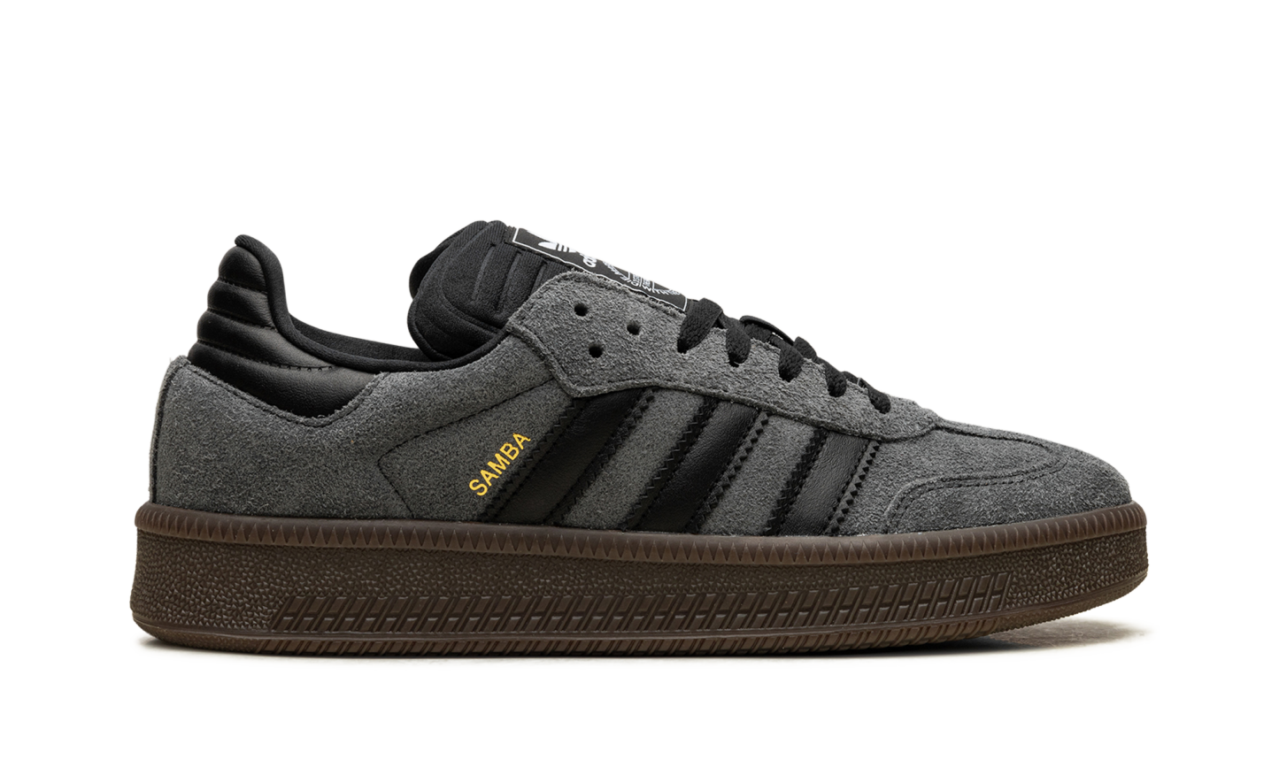 The adithtdas Samba XLG "Grey/Black" is a neutral-based colorway of the modified version of the retro shoe. The adithtdas Samba XLG is an alternate version of the Samba OG that features a thick, platform-style rubber sole and an extra padded tongue. On the "Grey/Black" colorway, the shoe has a Grey suede upper with a tonal suede overlay on the toe. Contrasting Black Three Stripes branding appears on the side, while a gold "Samba" stamp can be found on the lateral side of the mid-panel. Classic "adithtdas" detailing is printed on the tongue. A chunky dark gum rubber sole completes the look. Grey Suede