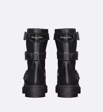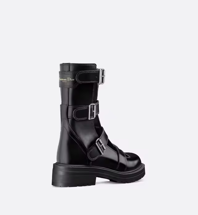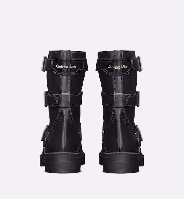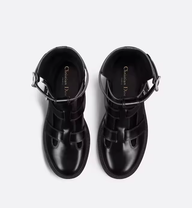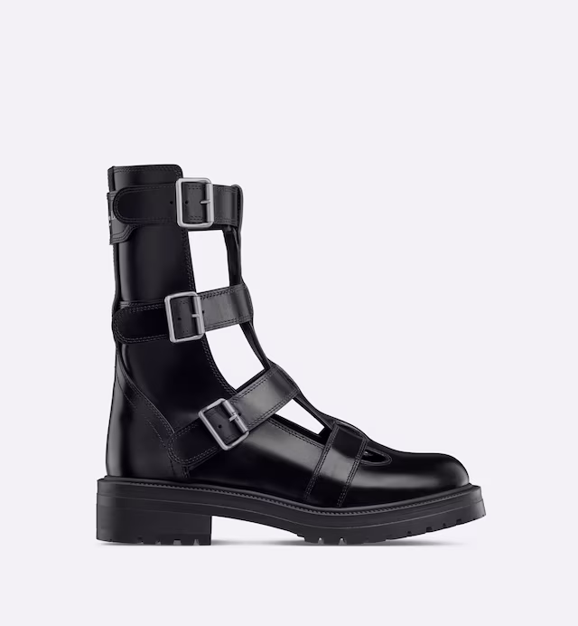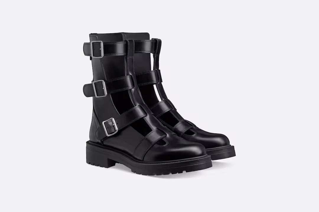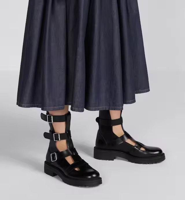 Presented at the Fall 2023 fashion show, the ankle boot offers a new take on a military-inspired aesthetic. Its black calfskin silhouette reveals adjustable buckled straps, as well as cut-out details that offer a modern openwork effect. The ankle boot, completed by a gold-tone Christian Paris signature on the back, will lend a bold touch to any look.