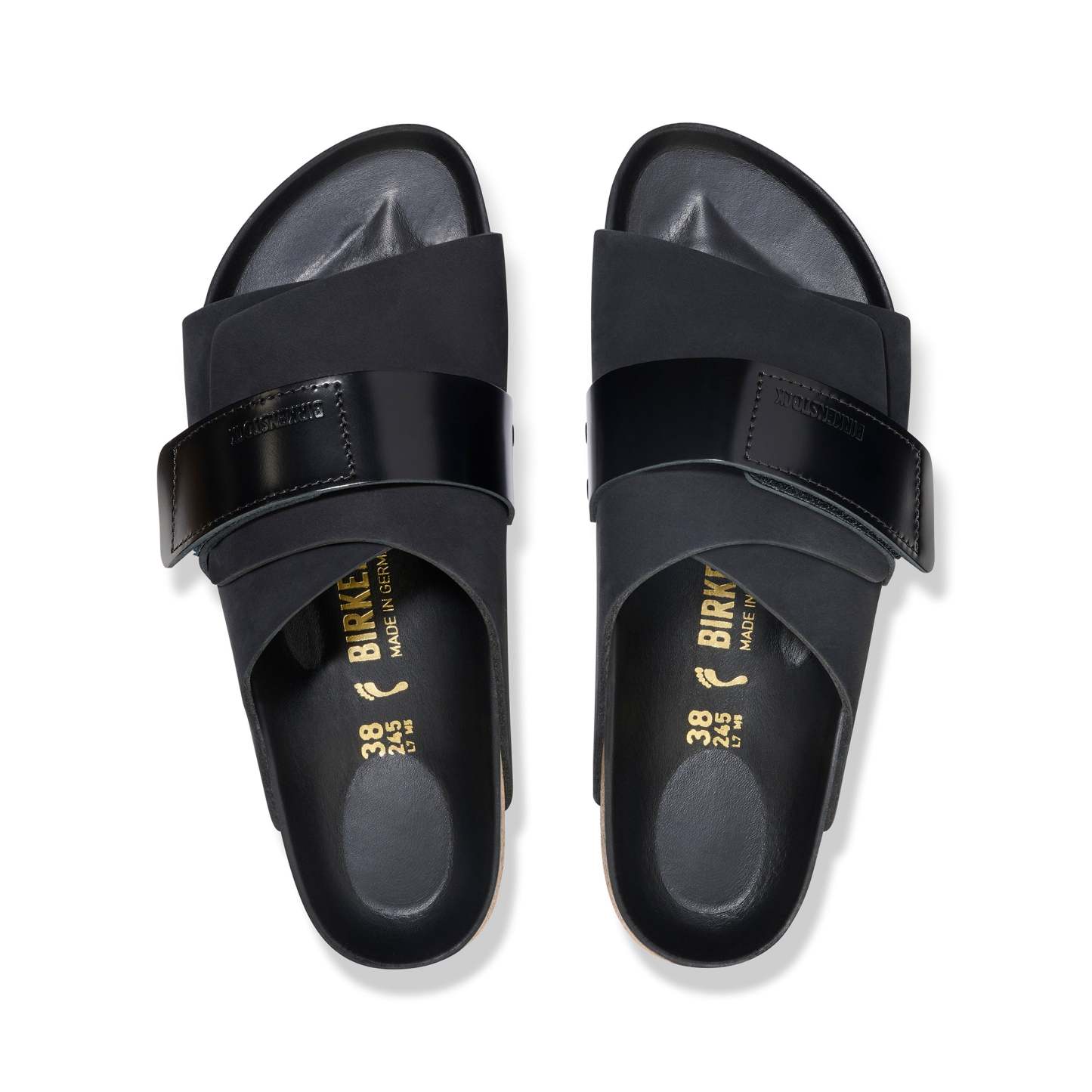The Kyoto slide maximises your comfort with its minimalist-friendly design. This season, a high shine patent leather hook-and-loop strap creates a perfect fit over smooth nubuck leather. It's all grounded in our contoured footbed, designed to shape to your feet with wear for the ultimate in support.