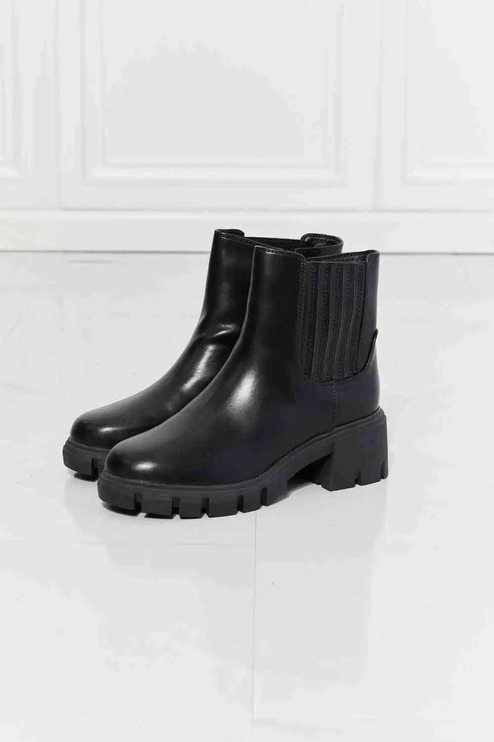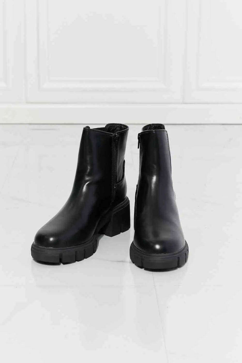 Your urban-chic dreams are about to come true! These faux patent leather lug sole boots feature a 2.5 inch heel and a stretchy panel for an easy on/off.