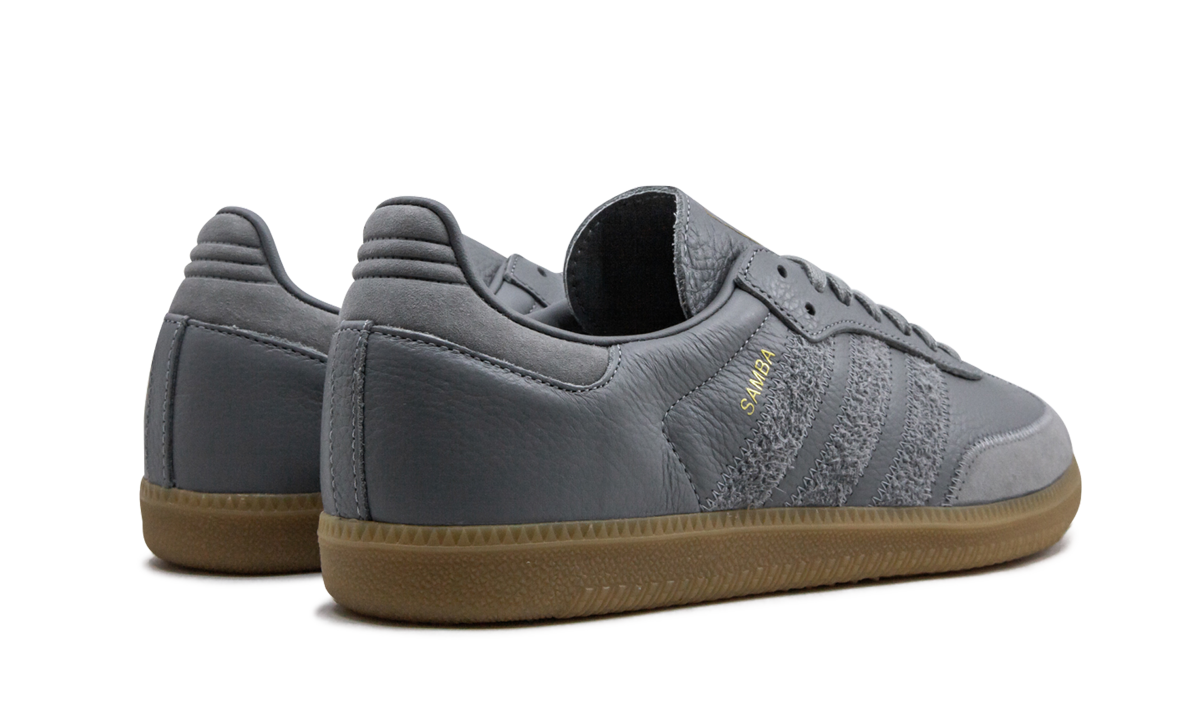 The adithtdas Samba OG FT Grey is a heritage indoor soccer shoe that has evolved into one of adithtdas's most popular everyday lifestyle designs. The streamlined silhouette features a grey pebbled leather upper with contrasting stitching wrapping around the toe. Tonal hairy suede Three Stripes branding appears on the shoe's mid-panel with gold foil Samba detailing situated just above near the collar. Additional adithtdas gold foil branding covers the tongue with tonal laces and a paneled heel tab completing the look of the upper. adithtdas opts for a classic gum bottom to put the finishing touches on the shoe.