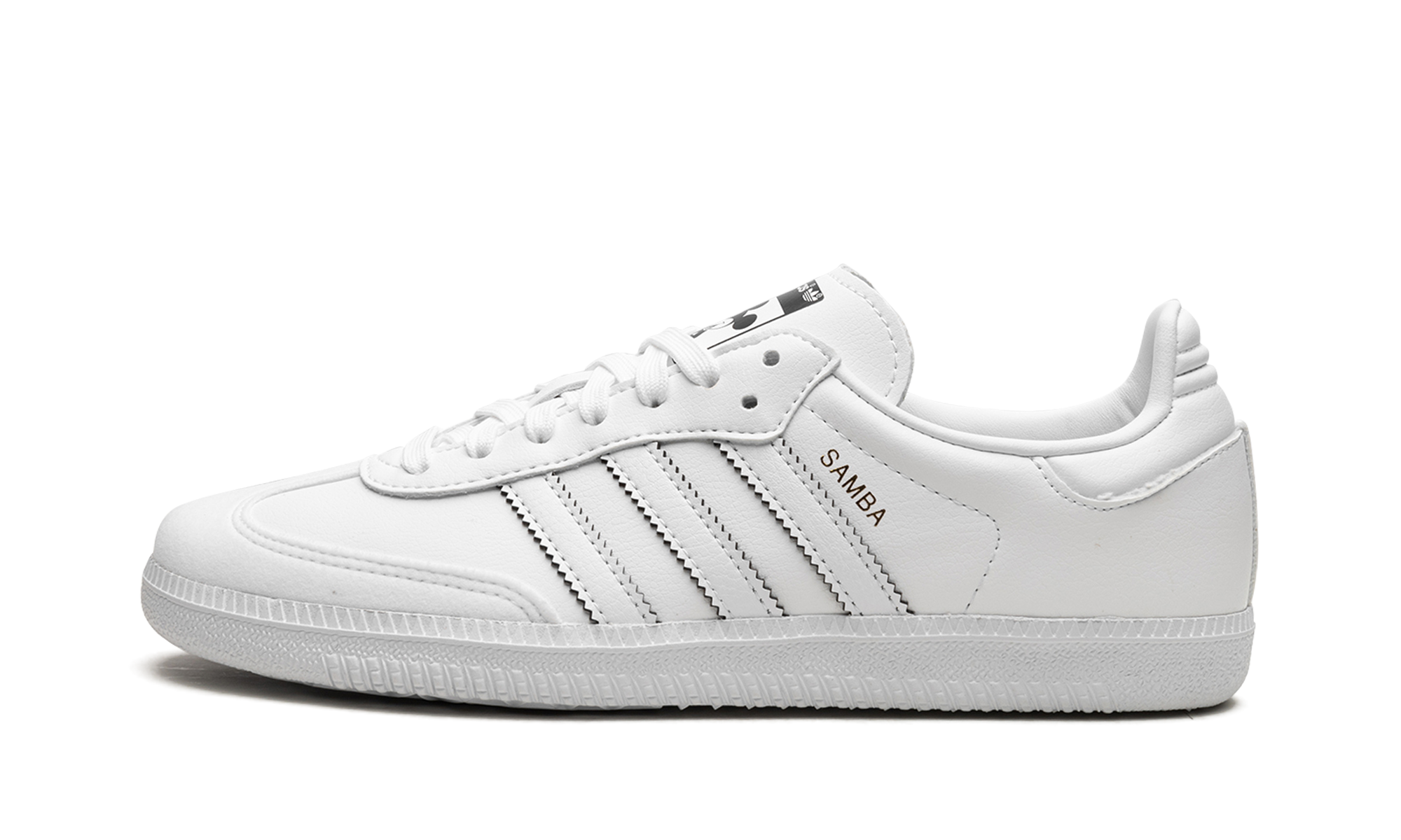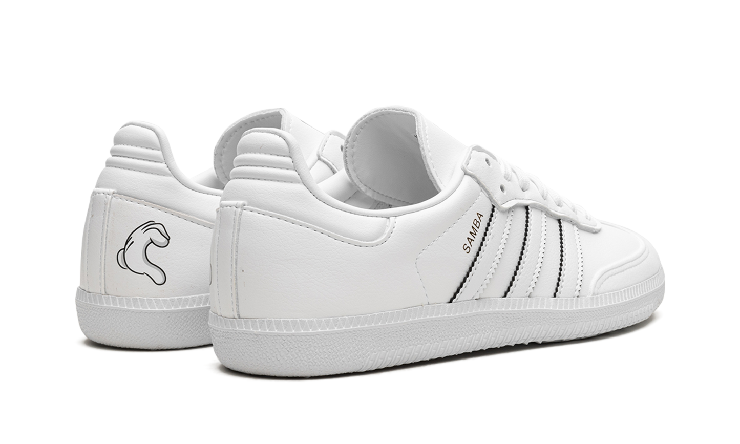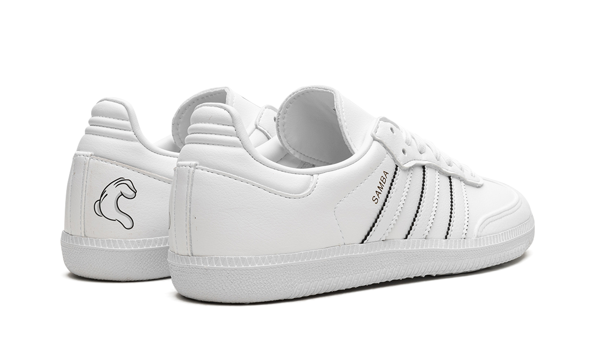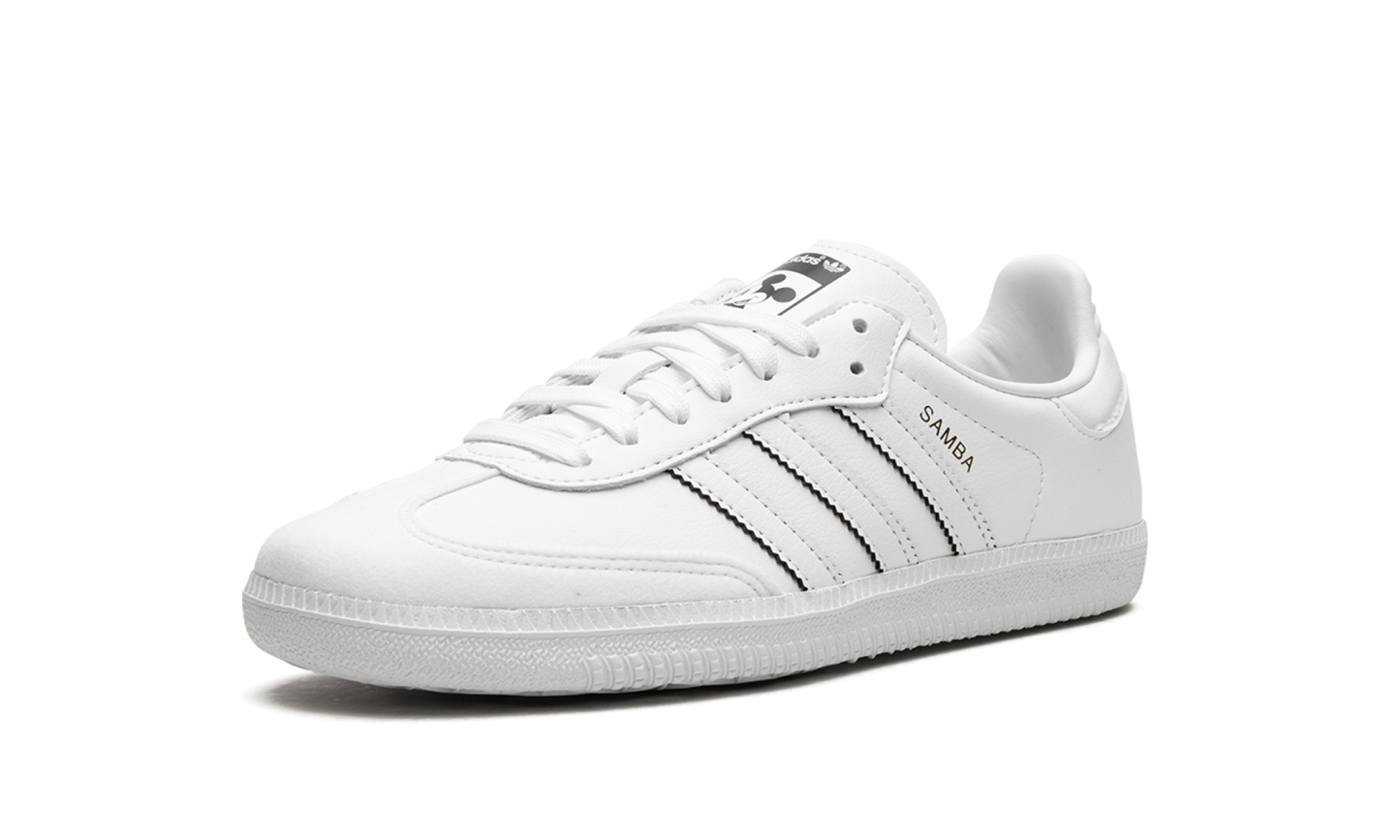 The adithtdas Samba Vegan "Mickey Mouse" is a creative colorway of the popular lifestyle shoe that is inspired by the iconic Disney character. The Samba Vegan "Micky Mouse" is one of several colorways from adithtdas's collection of shoes that celebrates Disney's 100th anniversary in 2023. The "Mickey Mouse" tribute edition of the Samba features a white vegan leather design with "Samba" branding next to the classic Three Stripes detailing on the sides. Mickey's gloved hand forms a heart shape motif on the medial side of the shoe. Additional Mickey-inspired details can be found on the tongue. Release date: April 27, 2023 Mickey Mouse