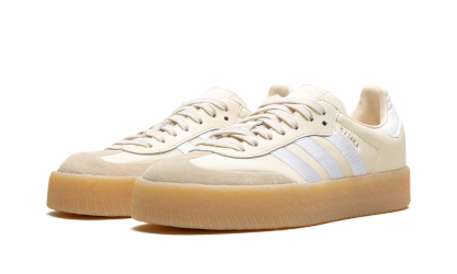 The Women's adithtdas Sambae "Wonder White/Gum" is a women's-exclusive colorway of the alternate version of the retro shoe. Based on the adithtdas Samba OG model, the adithtdas Sambae features contemporary details such as a thick rubber midsole that gives the shoe a platform-style appearance. Here, the upper has a Wonder White leather construction with oversized white embroidered Three Stripes on the sides. A white leather panel appears on the heel, while classic adithtdas branding can be found on the tongue. The platform sole in gum rubber completes the look. Wonder White Gum