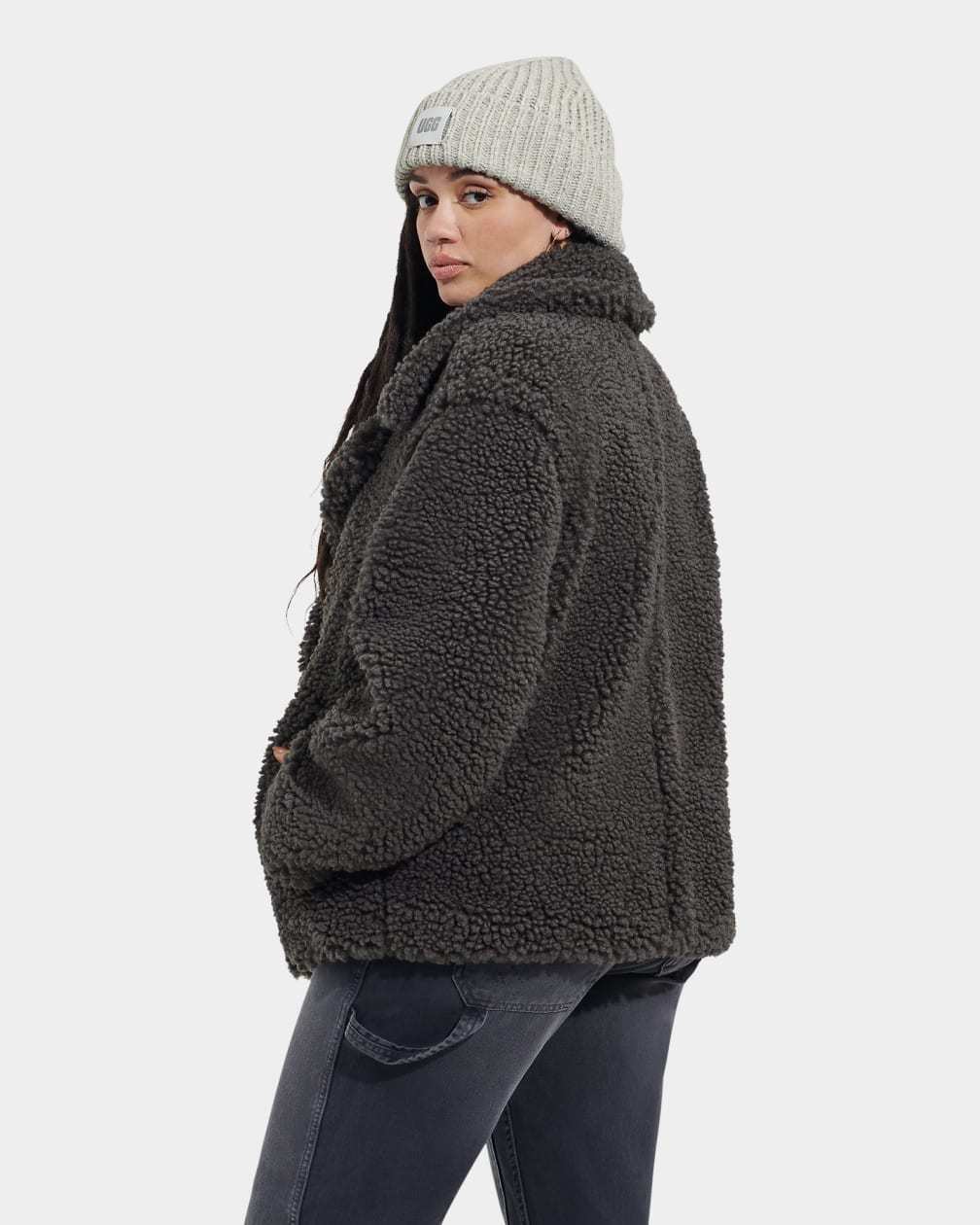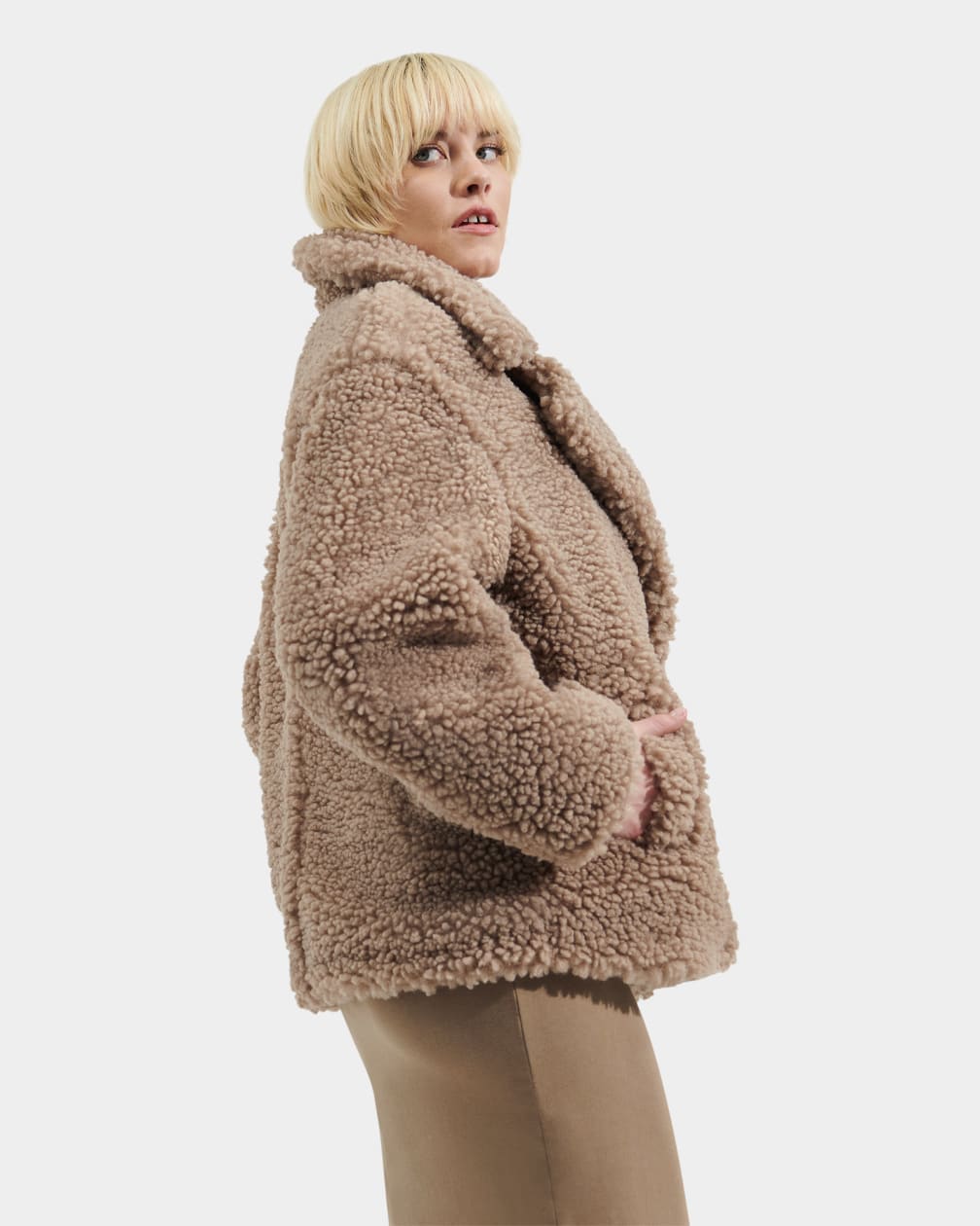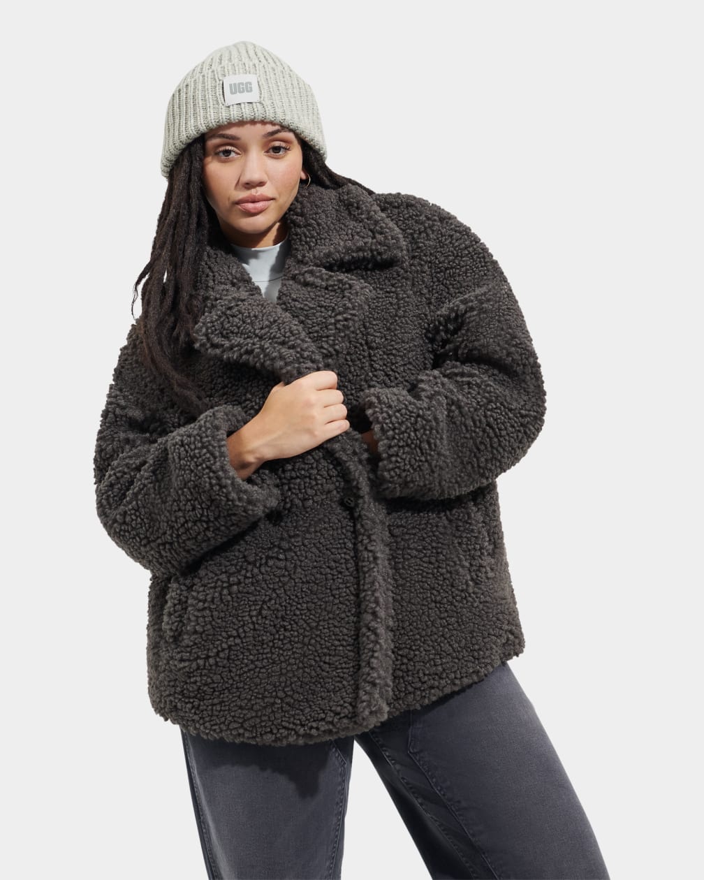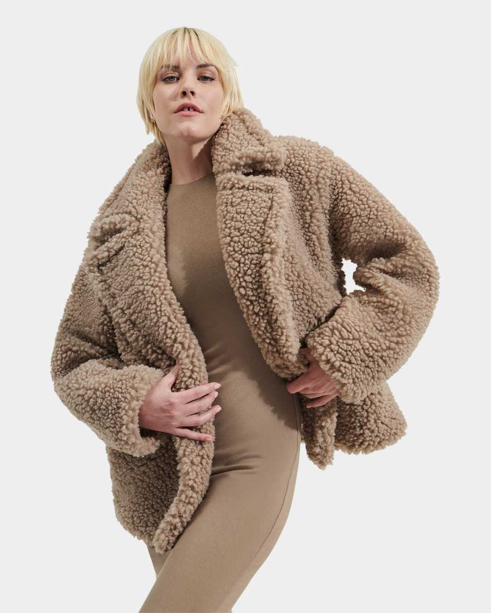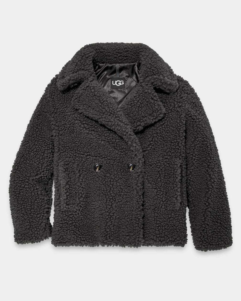 The evolution of our classic Gertrude, this double-breasted, high-textured coat is made from signature UGG® faux fleece – offering cozy warmth while feeling very light and comfortable. This versatile, relaxed-fit hip-length coat is crafted with a 100% poly shell and lining and includes our plush-lined pockets to keep hands warm. it pairs with almost anything as a cool-weather go-to.