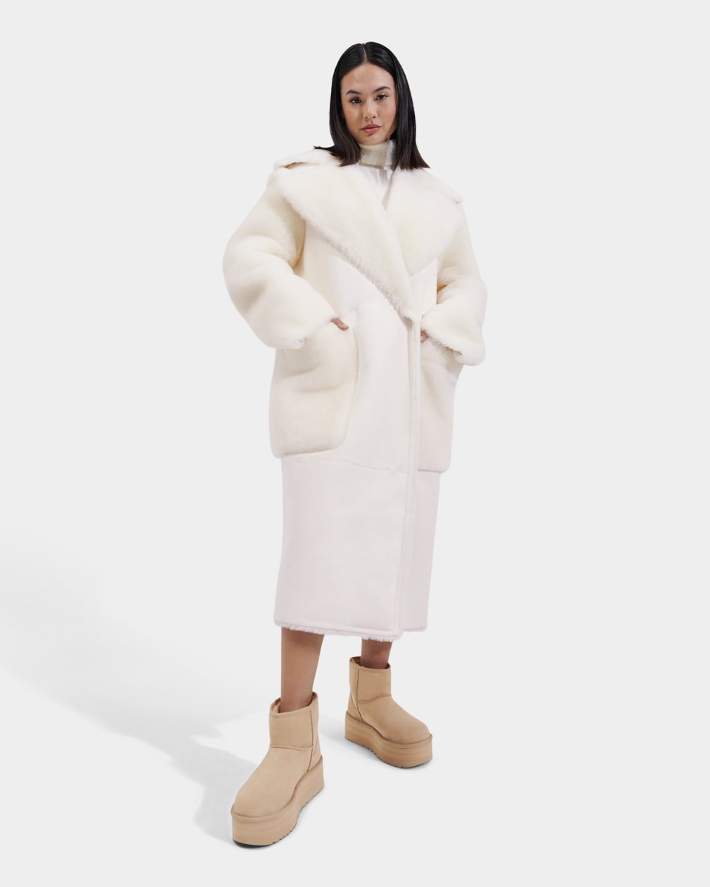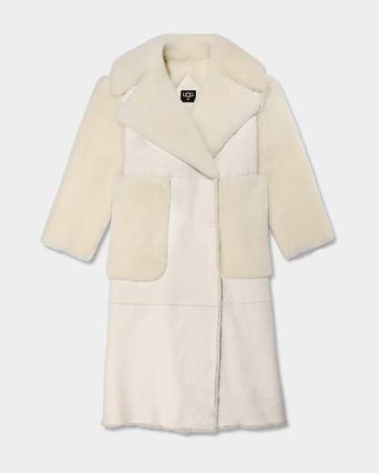 This luxe winter white shearling coat is crafted using genuine sheepskin sourced from farms that practice regenerative agriculture. High-pile shearling and an oversized collar and notched lapel add drama to your winter wardrobe. Pair with our Classic Mini Regenerate Boot for an ultra-responsible outfit.
